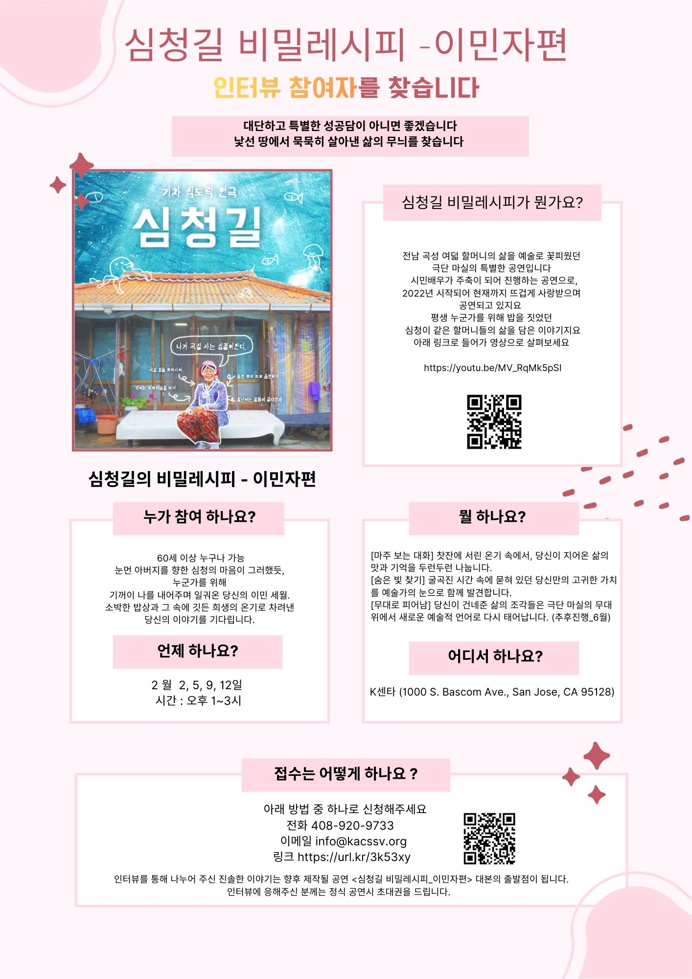 산호세 K센타에서 2026년 2월 2,5,9,12일 (오후1~3시)에 당신의 이야기를 기다립니다.